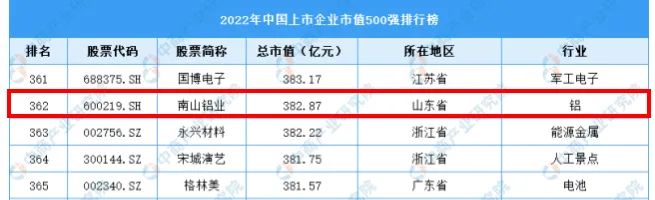 近日,2022年中國上市企業(yè)市值500強排行榜發(fā)布,南山鋁業(yè)躋身其中,總市值382.87億元,位列第362位。